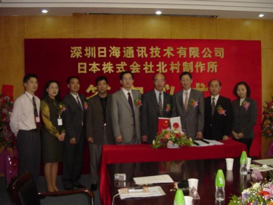 2004年4月13日,公司与日本株式会社北村制作所就户外一体化机房的设计、生产、销售和服务在日海智能签订了合作协议,共同合资组建深圳北村日海机房技术有限公司,并举行了隆重的签字仪式。公司周展宏董事长、王文生总裁、杨飞董事、机房事业部负责人孟庆光和日本北村制作所北村泰作董事长、永井正幸常务董事等出席了签字仪式。